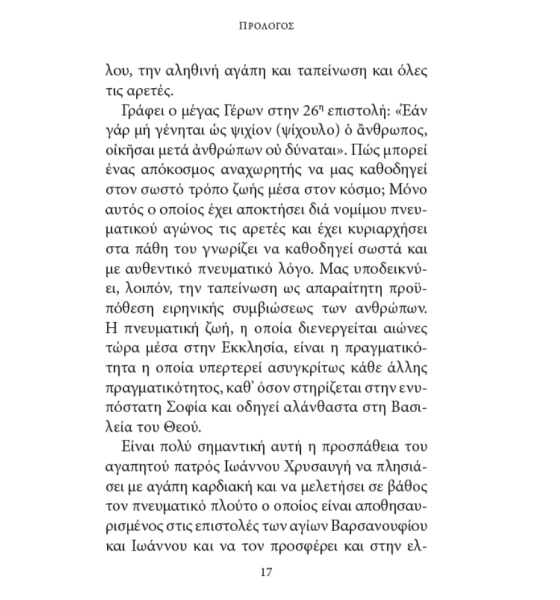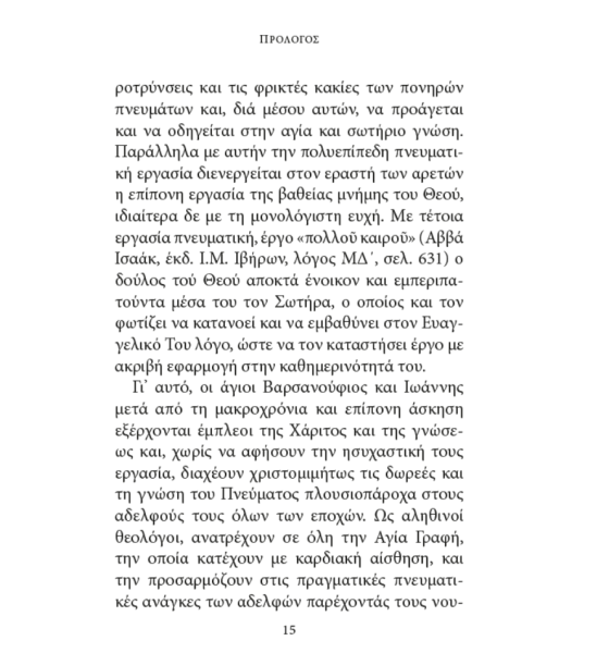 «Αν επισκεπτόμασταν τη Γάζα στις αρχές του 6ου αιώνα, όχι πολύ βαθιά στην έρημο, θα βρίσκαμε μια αξιόλογη μοναστική κοινότητα. Στο κέντρο της ήταν δυο Γέροντες που ζούσαν σε αυστηρό εγκλεισμό, ο Βαρσανούφιος και ο Ιωάννης, γνω¬στοί αντίστοιχα ως «ο Μέγας Γέρων» και «ο άλλος Γέρων». Οι δύο αυτοί Γέροντες έχαιραν ευρύτατου σεβασμού ως χαρισματικοί σύμβουλοι. Κανείς από τους δύο, όμως, δεν μιλούσε πρόσωπο με πρόσω¬πο με όποιον ζητούσε την καθοδήγησή τους. Οι ερωτώντες έπρεπε να υποβάλουν τις ερωτήσεις τους γραπτώς και εν ευθέτω χρόνω έπαιρναν γρα¬πτή απάντηση από τον έναν ή τον άλλο γέροντα ή καμιά φορά και από τους δύο. […] Είναι πράγμα¬τι ευτύχημα ότι διασώθηκαν στα ελληνικά περί τις 850 ερωταποκρίσεις. Κανένα άλλο τεκμήριο από την πρωτοχριστιανική περίοδο δεν μας δείχνει με τόσο ζωηρές λεπτομέρειες πώς γινόταν αντιληπτή η πνευματική καθοδήγηση και πώς εφαρμοζόταν πρακτικά. Με ελάχιστη επεξεργασία, οι Επιστολές αποκαλύπτουν την αληθινή φωνή εκείνων που ρωτούν και εκείνων που απαντούν, με αμεσότητα και οικειότητα, αλλά και με ενάργεια και ζωντά¬νια. Η γραμματεία της Ερήμου δεν θα μπορούσε να μοιάζει περισσότερο με μεταγραφή σημειώσε¬ων από περιπτωσιολογία προσωπικού θεραπευτή.»