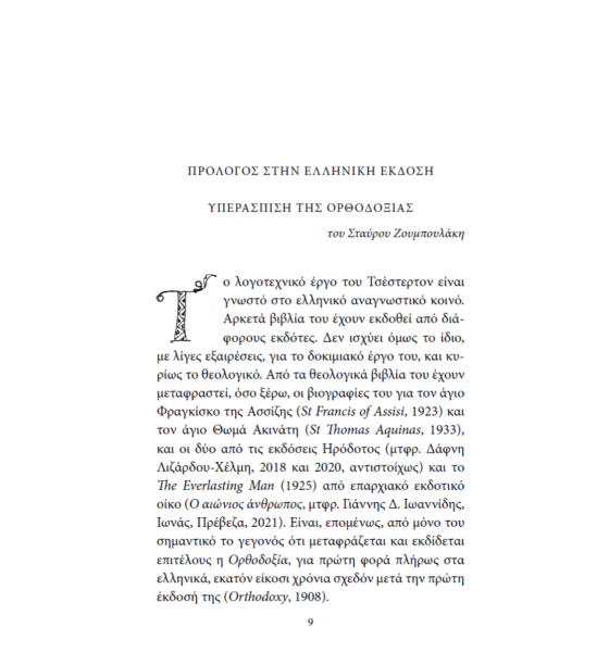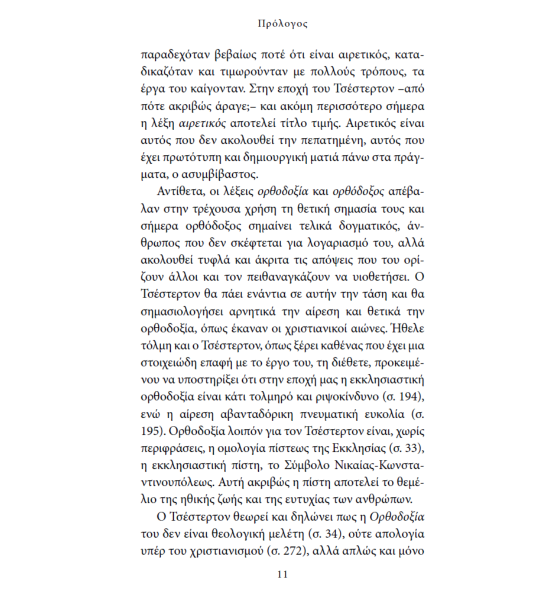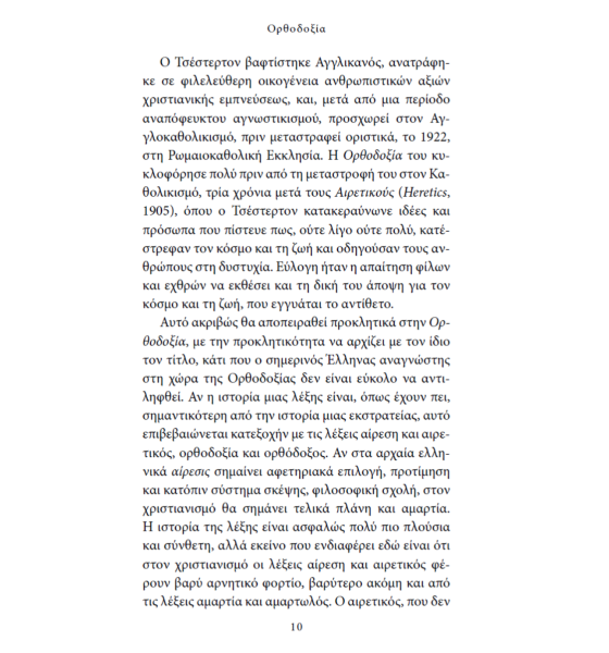 «Ορθοδοξία για τον Τσέστερτον είναι, χωρίς περιφράσεις, η ομολογία πίστεως της Εκκλησίας η εκκλησιαστική πίστη, το Σύμβολο Νικαίας-Κωνσταντινουπόλεως. Αυτή ακριβώς η πίστη αποτελεί το θεμέλιο της ηθικής ζωής και της ευτυχίας των ανθρώπων.