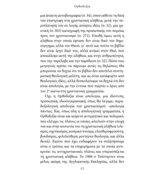 Θα μπορούσα να δεχτώ ότι το βιβλίο δεν αποτελεί συστηματική θεολογική μελέτη, και ας είναι κατάφορτο από θεολογικές ιδέες, αλλά δυσκολεύομαι να δεχτώ ότι δεν είναι απολογία, με την έννοια που παίρνει ο όρος από τον 2ο αιώνα στη χριστιανική γραμματεία. Όχι, η Ορθοδοξία είναι απολογία, μια ιδιότυπη, προσωπική, ιδιοσυγκρασιακή, όπως θα λέγαμε, παραδοξολογική απολογία του χριστιανισμού –απολογία πάντως.