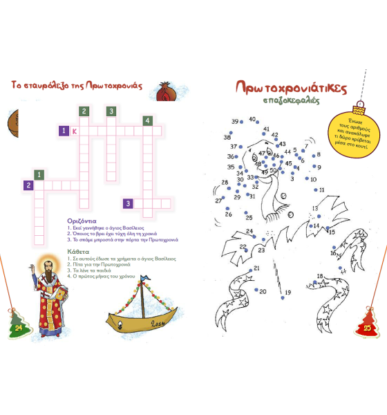 Κι όλα αυτά με τρόπο διασκεδαστικό, με πολλά παιχνίδια γνώσης και μνήμης, ζωγραφική, σταυρόλεξα, σπαζοκεφαλιές, κρυπτόλεξα και αυτοκόλλητα. Και μη ξεχάσετε τα τρίγωνα σας γιατί το βιβλίο μας είναι στολισμένο με πολλά παραδοσιακά κάλαντα!